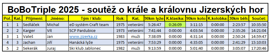BoBoTriple je také u konce a známe tak staronového Krále Jizerských hor, kterým není nikdo jiný, než Michal Sedláček, jenž zvládl 90 km na lyžích, 90 km na kole a 30 km běh v čase 10:35:50. Je to jeho již sedmé vítězství z dvanácti ročníků.